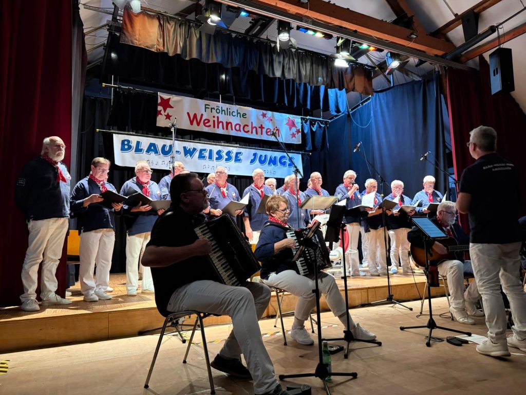 Der Ahrensböker Shantychor „Blau-weisse Jungs“ kam fröhlich und gut gelaunt auf die Bühne mit dem Titel „Feliz Navidad“ und wurden von den Zuhörern mit großer Freude empfangen.